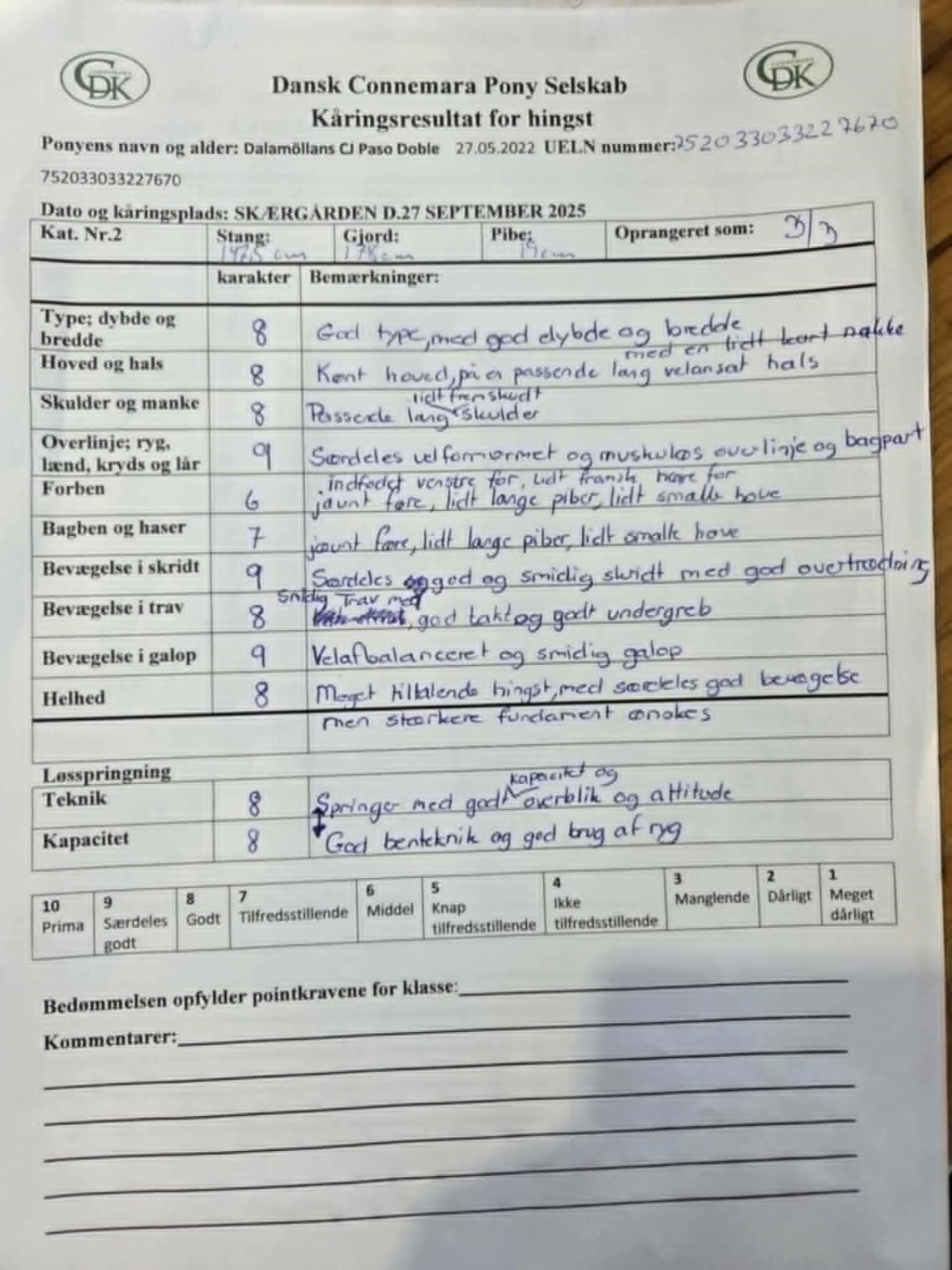 Paso visades på kåring/ bruksprov i Danmark 2025 med strålande resultat. Han va dagens högst bedömda hingst med 8or och 9 or i protokollet. Tyvärr såg de en liten felvinkel i hovvinkeln som gav honom en 6a på frambenen och en 7a på bakbenen. Oklart om det beror på dagens hovstatus eller inte, men det gav honom en klass II status.